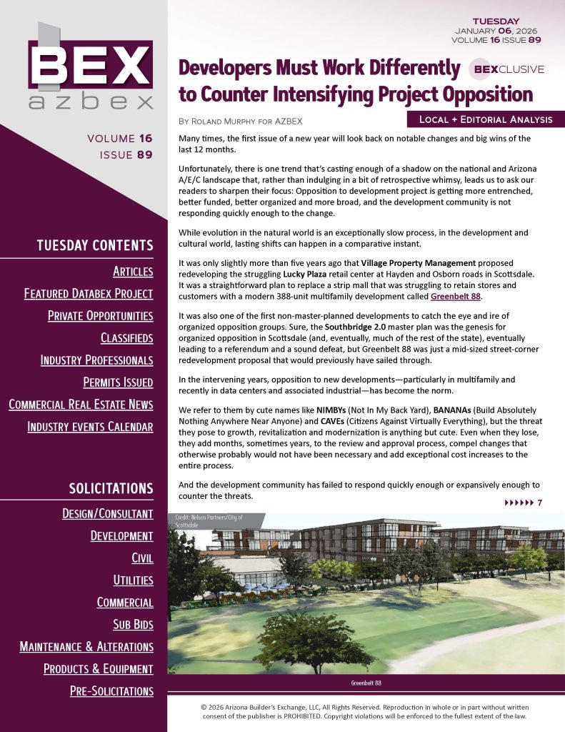 This tool comes in the form of a 60-70 page PDF emailed twice a week to our paid subscribers. Each issue contains hundreds of open project solicitations, articles on all types of industry information including: projects in planning and development, legislative issues, trends, budgets and local news. AZBEX also covers industry events, CRE transactions, people on the move, bid results & project awards and permits.