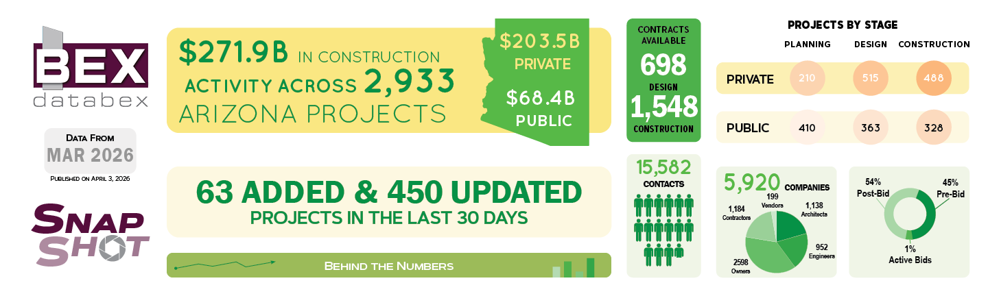 DATABEX is an online database tool for anyone involved in Arizona Architecture, Engineering & Construction who needs to know about future infrastructure and commercial real estate development projects. DATABEX consists of major projects ($5M+ total construction costs) that our research team finds through various sources very early in the planning and design process. The team adds all the relevant data, documents and contact information for the owner, design firm and general contractor. Then the team diligently follows up on the projects as they move forward, notifying users of changes as they happen.